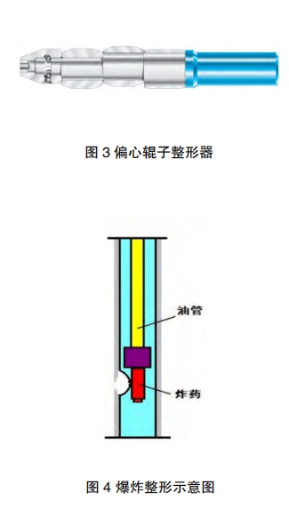 旋轉 碾壓法適用于套管變形井的整形 復位。 爆炸整形。爆炸整形工藝技 術是利用火藥燃爆瞬間產生的巨 大能量,通過介質的傳遞,將化 學能轉變為機械能來克服套管的 圖 1 梨形銑錐 圖 2 梨形脹管器圖變形應力和巖層的擠壓應力。爆 炸沖擊波速度超過套管及套管外 巖石的本身動態屈服極限。它能 對變形后井徑不小于 70mm 的套 管進行整形,使其通徑恢復生產 要求。但是其藥量難易掌握,整 形效果不穩定(圖 3、圖 4)。