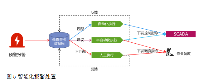 智能化報警處置技術。建立健全生產運行預警、報警處置參考數據庫,將預警報警結果分類為自動化執行、半自動化執行,人工執行等種類,按預警報警結果進行匹配,匹配成功的按照相關流程處理,如圖5。