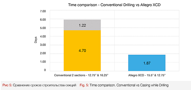 在其中一個項目的地面段實施該技術,已經將建井周期縮短了3倍,見圖5。因此,在操作上花費的時間越少,向大氣中排放的污染物就越少。