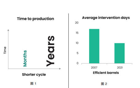 重新審視成熟油田的生產還有助于提高可持續性的開采。開發一個新油田需要勘探、鉆井施工、一個鉆井平臺和其他生產設施,所有這些都會增加運營過程中的碳排放。通常,成熟的油田由于可以重復利用現有基礎設施以及可能的、經過時間優化的更高效的開采方法,施工導致的碳排放通常會較低,見圖3(油井干預在顯著降低二氧化碳排放的情況下提高了油氣產量)。