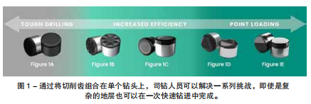 利用最新的材料研究成果, 開發了一套完整的異形切削齒 ( 圖 1),以解決一系列具有挑戰性的 地層類型和應用。鉆井工程師可 以將專用切削齒組合在單個鉆頭 上,以有效地鉆穿復雜的地層。 在這些開發工作中出現的一 種先進切削齒 ( 圖 1A) 是一種提 高硬地層性能的設計。由此產生 的切削齒具有新穎的邊緣幾何形 狀,可以承受高沖擊載荷,并且 在金剛石表面具有二次倒角,使 其能夠承受比聚晶金剛石復合片 (PDC) 切削齒更高的載荷。這使 得它能夠在堅硬的互層地層中保 持鉆井效率,從而提高了該段的 圖 1 - 通過將切削齒組合在單個鉆頭上,司鉆人員可以解決一系列挑戰,即使是復 雜的地層也可以在一次快速鉆進中完成。