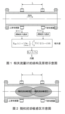 相 關 流 量 計 的 研 發 歷 史 可追 朔 到 上 世 紀 五 十 年 代。 英 國Butterfield 等人首先發現運動鋼帶表面微小凹凸所引起的機械隨機信號,并提出實現了鋼帶運動速度的相關測量系統。此后,相關測量理論得到很大發展,形成了很多相關測量技術。相關流量計測量原理相關流量計實際上是流速測量系統,其結構及測量原理如圖 1 所示。