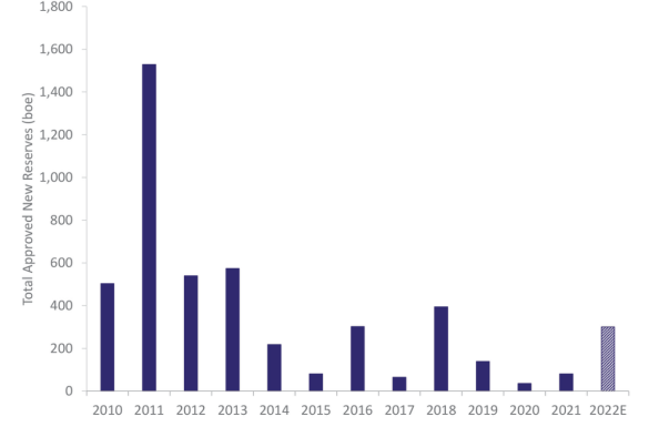 該集團(tuán)的《商業(yè)展望》指出,在過去十年中,英國大陸架新油氣項目的批準(zhǔn)數(shù)量一直在下降。原因之一是該盆地的成熟度限制了投資機(jī)會。此外,運(yùn)營商和投資者一直擔(dān)心政治和公眾對海上勘探的支持程度。2021年,只有8000萬BOE的新UKCS資源被批準(zhǔn)開發(fā),其中3500萬BOE用于天然氣田。根據(jù)OEUK的數(shù)據(jù),開發(fā)這些儲量將花費(fèi)運(yùn)營商大約9.75億美元(7.5億英鎊)的新資本投資。