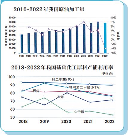 2022年面對世界動蕩加劇、全球通脹持續蔓延、經濟復蘇動力減弱等復雜嚴峻局面,石油和化工行業持續推動創新驅動和綠色轉型,行業運行質量進一步提高,各項經濟指標超出預期,為國家能源安全和經濟社會發展提供了堅實保障。同時,受宏觀經濟放緩、能源價格上漲、疫情超預期反復等因素影響,房地產、汽車等主要下游市場需求有所下滑,行業內部運行分化加劇。具體表現在:
