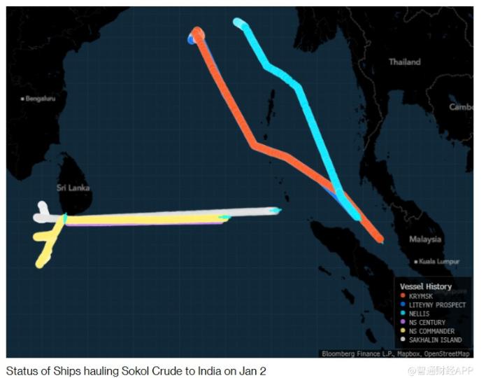 據(jù)報(bào)道,許多運(yùn)輸俄羅斯原油的船只此前一直在印度附近徘徊,如今正駛離印度向東航行。由于印度煉油廠對(duì)向俄羅斯支付石油款項(xiàng)感到擔(dān)憂,上月運(yùn)往印度的俄羅斯原油數(shù)量大幅下降。船只跟蹤數(shù)據(jù)顯示,從俄羅斯遠(yuǎn)東地區(qū)裝載索科爾石油的5艘船只——“NSCommander”號(hào)、“SakhalinIsland”號(hào)、“Krymsk”號(hào)、“Nellis”號(hào)和“LiteynyProspect”號(hào)——正以7到10節(jié)的速度駛向馬六甲海峽。第6艘同樣裝載索科爾石油的“NSCentury”號(hào)仍然靠近斯里蘭卡。